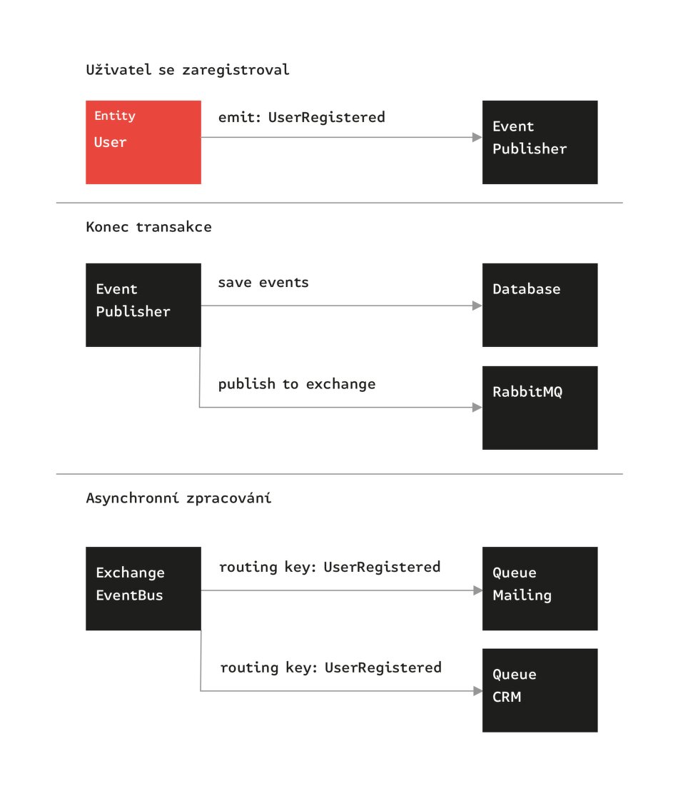V první fázi vytvoříme novou entitu uživatele a přímo v konstruktoru emitujeme event UserRegistered. Na tuto událost naslouchá RabbitMQ consumer, který vytvoří e-mail a zajistí jeho odeslání skrze mailingovou službu. Pokud má služba výpadek, můžeme zprávu přesunout do jiné fronty a e-mail odeslat později.