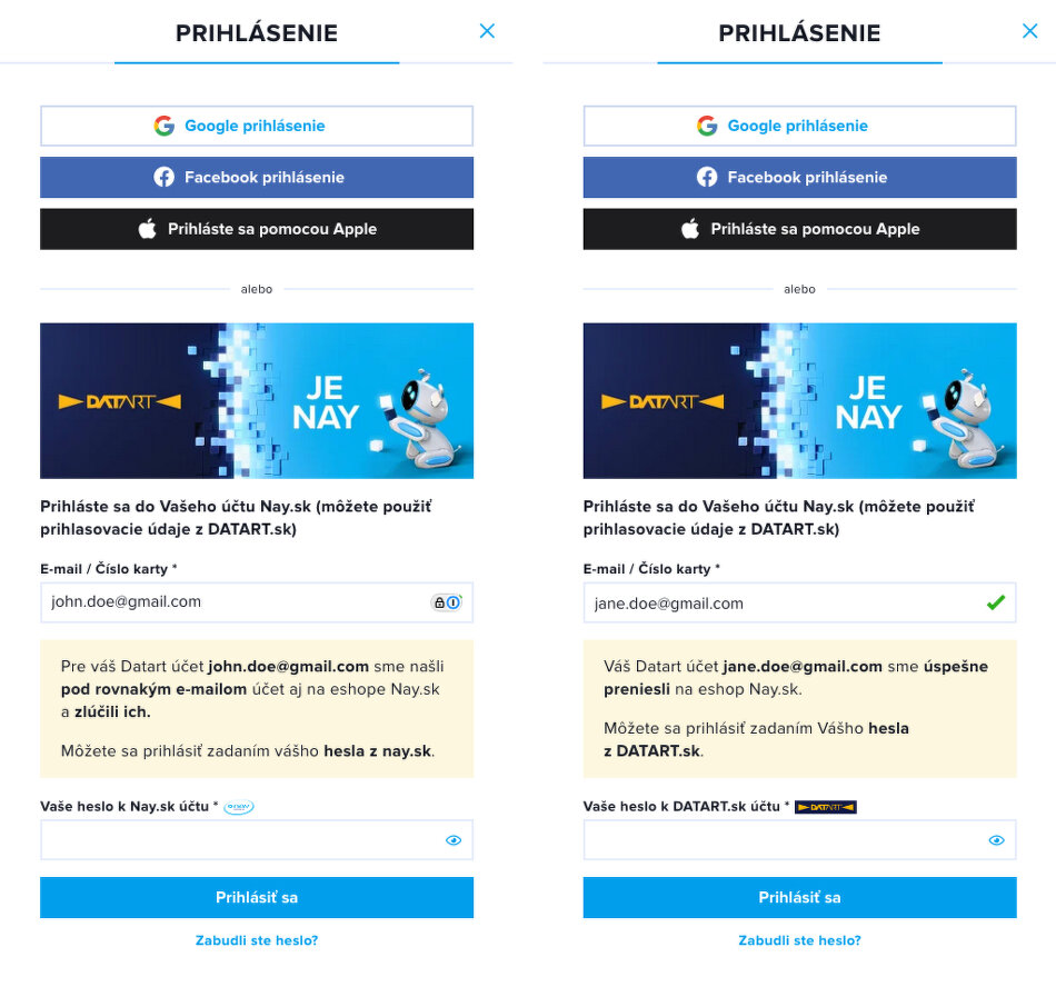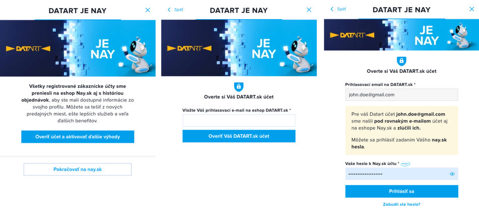 Pouze jsme jim skrze naši onboarding grafiku napověděli, jaké heslo mají použít – zda to z Datart.sk, nebo to, které standardně používají pro Nay.sk. A to jak skrze vysvětlení v info hlášce, tak použitím loga u inputu pro zadání hesla. Zároveň jsme zákazníka informovali, jakým způsobem byl jejich účet zmigrován.