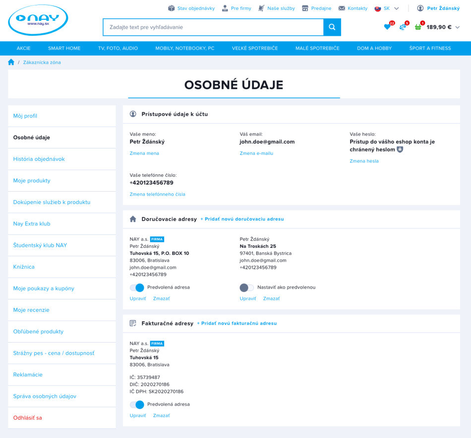 Na všech 4 e‑shopech měl/má zákazník k dispozici své základní osobní údaje a navíc i možnost si nadefinovat a uložit do profilu více fakturačních a dodacích adres. Kromě základních přihlašovacích údajů bylo cílem migrovat i tyto osobní údaje a adresy.