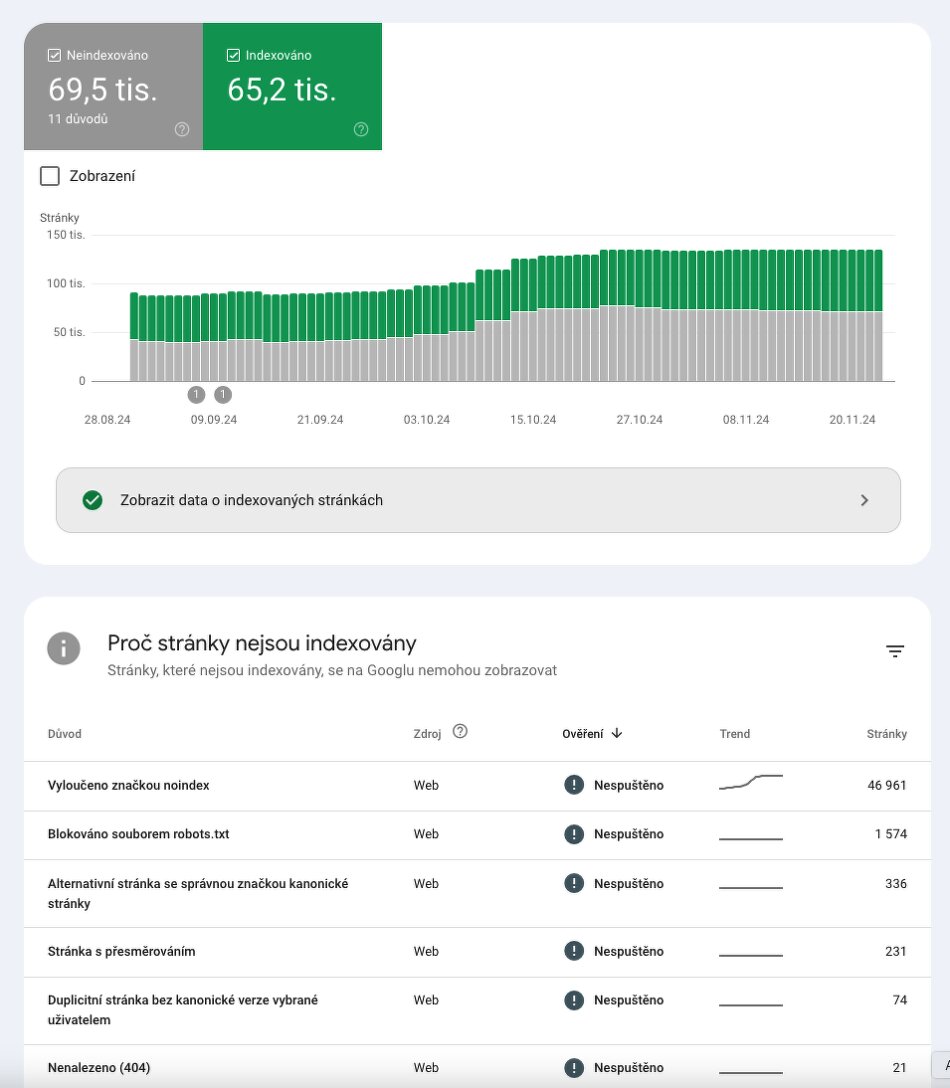 Ale zpět ke statistikám indexace. U podstránek, které jsou v grafu šedé, vidíte, že indexované Googlem nejsou. A důležité je, projít si důvody, které jsou uvedeny níže.