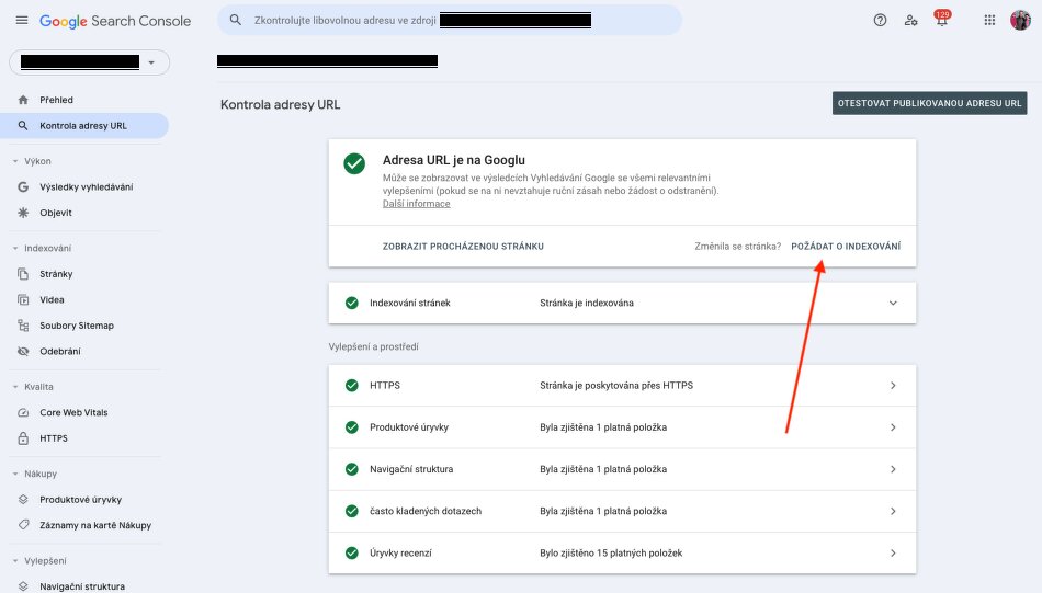 Pokud jste na svůj web přidali nový, hodnotný obsah, nebo upravili existující stránku, můžete to Google říci. Výrazně tím urychlíte načtění tohoto nového obsahu a dříve uvidíte efekt těchto změn. Jednoduše dejte kompletní URL adresu do horního řádku a po načtení klikněte na „Požádat o indexování“.