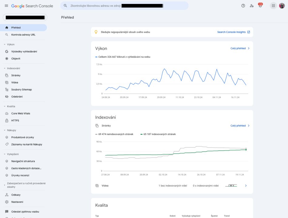 Poté, co se do Search Console přihlásíte, obvykle se před vámi objeví spousta dat. Google si je totiž u každého webu uchovává, takže váš nový účet vám je jen zpřístupní. Výjimkou jsou zcela nové weby, kde se informace začnou objevovat postupně, jak bude Google váš web procházet a poznávat.