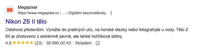 V těchto částech najdete informace o tom, jak váš web čte tzv. rich snippets. Tedy doplňkové informace, které můžete ve zdrojovém kódu vyhledávačům předávat. Odměnou pak je výrazně zajímavější výpis ve výsledcích Google, kde je mnohem vyšší pravděpodobnost, že potenciálního uživatele naláká. Příklad jednoho z našich e-shopů vypadá třeba takto: