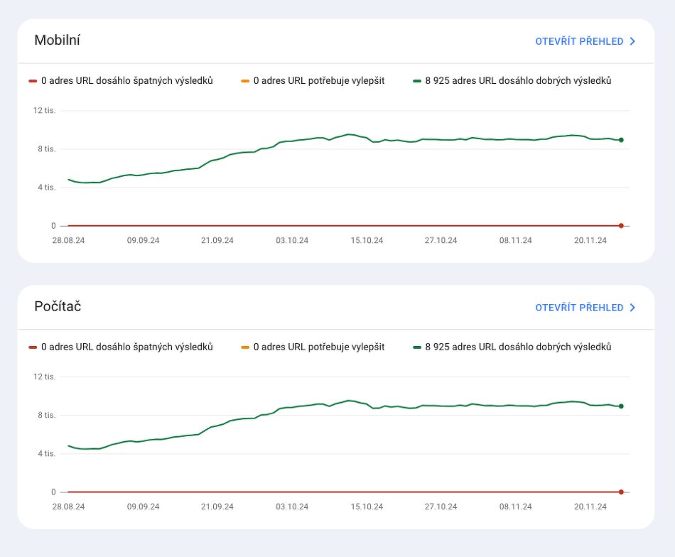 Pokud se v oboru tvorby webů pohybujete, určitě znáte metriky Core Web Vitals. Zjednodušeně měření rychlosti a kvality zobrazování vaší stránky uživateli. V poslední době čím dál více platí, že Google má rád rychlé weby. Takže rychlé načtení a zobrazení vašeho webu vám dává značné body i v určování pozic. Jednorázově si můžete váš web zkontrolovat zde https://pagespeed.web.dev/. V Google Search Console pak vidíte tuto statistiku v čase. Ne tedy přesné hodnoty jednotlivých kritérií, ale alespoň poměr stránek, které jsou v pořádku oproti těm, které vykazují nějaké nedostatky.