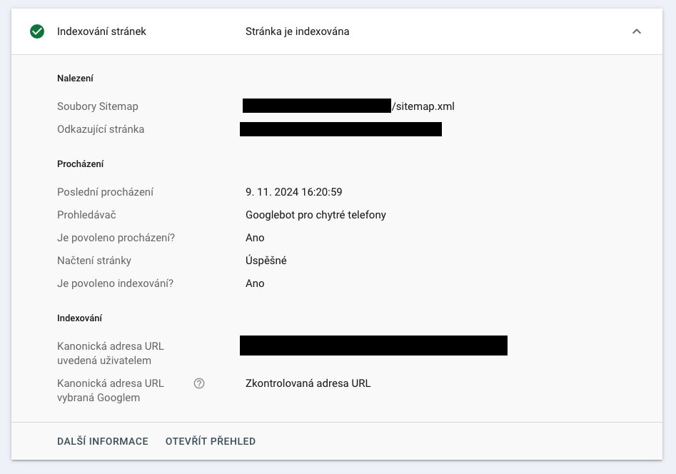 Pokud si rozkliknete „číst Indexování stránek“, můžete také zkontrolovat, jestli o dané stránce už Google ví, kdy ji naposledy indexoval, či zda je obsažena v souboru Sitemap.xml.