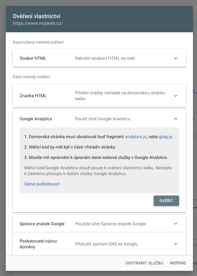 - Přístup k jiné službě Google: Pokud už na daném webu máte přístup do Google Analytics nebo Google Tag Manageru, je to nejjednodušší cesta. Stačí jeden klik a dostanete se i do Google Search Console.