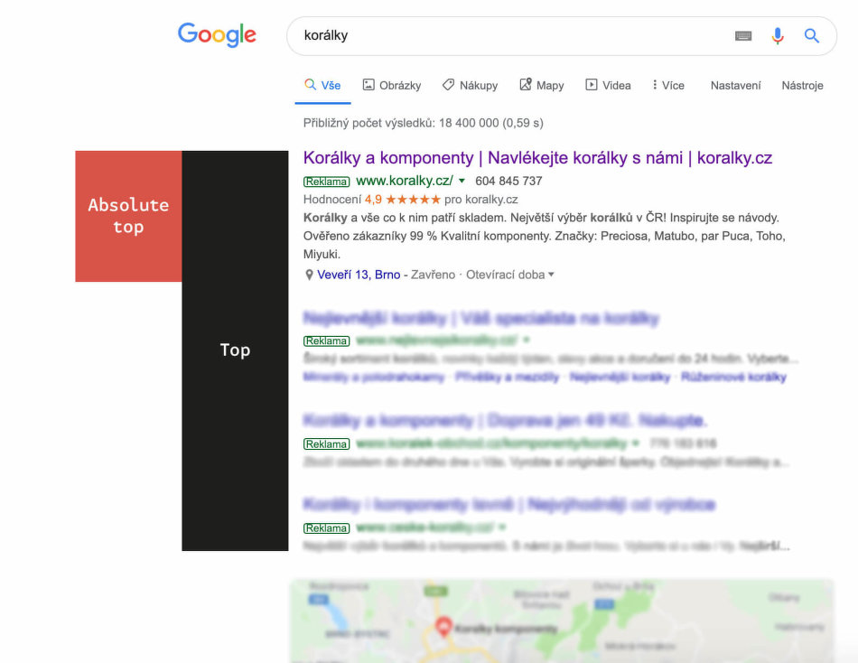 Metrika nám umožnila hlídat průměrnou pozici naší reklamy ve výsledcích vyhledávání na Googlu. Prozradila nám, na jaké průměrné pozici se naše reklama zobrazuje. V případě že bylo číslo vyšší jak 4 – častěji jsme se zobrazovali pod organickými výsledky vyhledávání. V opačném případě jsme se zobrazovali v horní části stránky, tedy nad organickými výsledky vyhledávání. Zde jsou 4 reklamní pozice. V případě, že obsadíme pozici 1–1,5, zobrazujeme se na TOP umístění.