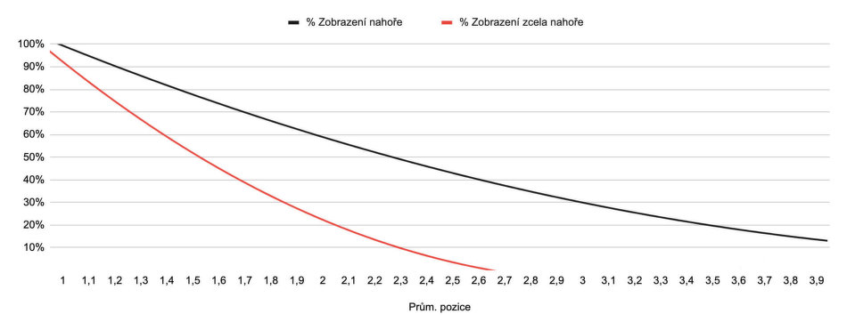 Když si uděláme průsečík hodnot, zjistíme, že pravděpodobně pro původní průměrnou pozici 1,5 budeme mít nyní „Zobrazení nahoře“ 80% a „Zobrazení zcela nahoře“ 50%.
