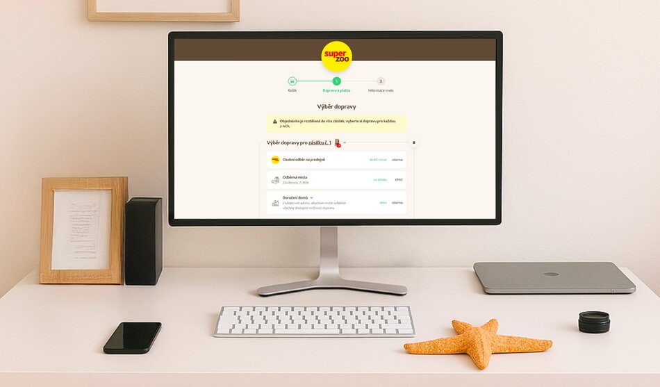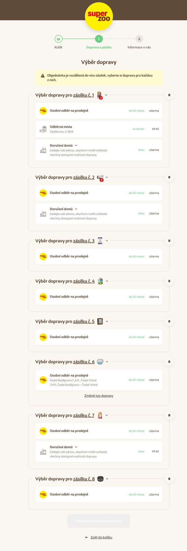 Split, neboli možnost rozdělit objednávku na více samostatných zásilek, ocení větší hráči, kteří se pohybují v omnichannel prostředí (tedy mají e‑commerce i kamenné obchody) a chtějí svým zákazníkům nabídnout co největší flexibilitu. Jako příklad si vezměme Super zoo, jehož e‑shop jsme nedávno redesignovali. Kromě e‑shopu provozují stovky kamenných prodejen, centrální sklad a k tomu využívají desítky tisíc výdejních míst (Zásilkovna, výdejní boxy, apod.).
